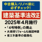 - 中古購入・リノベ前に必ずチェック!2025年4月施行の建築基準法改正とは?2025年4月から建築基準法が改正!木造2階建てでも構造・省エネ審査が必須に。中古購入・リノベ前に必ず確認したい新ルールをわかりやすく解説。